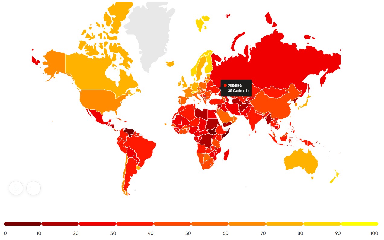Україна отримала 35 зі 100 балів в Індексі сприйняття корупції за 2024 рік, і тепер займає 105 позицію поміж 180 країн