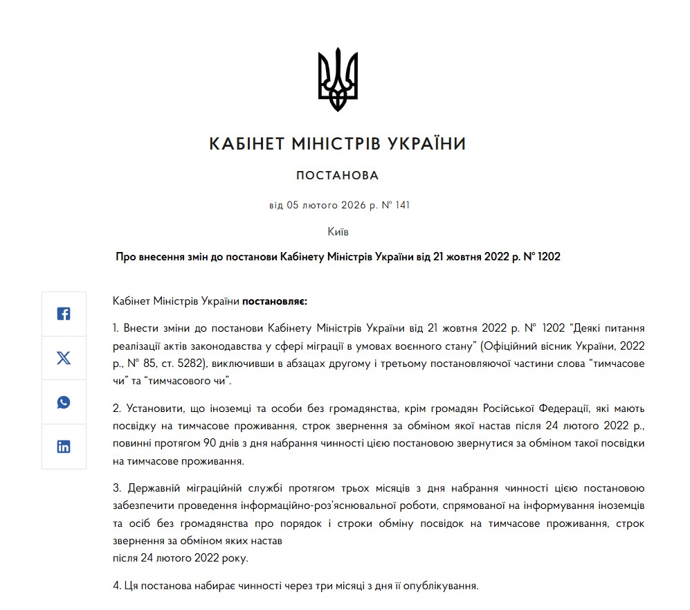 Уряд прийняв постанову від 5 лютого 2026 №141 «Про внесення змін до постанови Кабінету Міністрів України від 21 жовтня 2022 р. №1202». Про це повідомила Державна міграційна служба України.